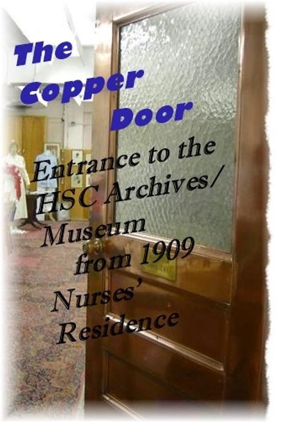 The Archives/Museum is behind a copper door which was originally the door to an elevator in the previous School of Nursing residence (1907 – 1997). The room was renovated by HSC in 2008 to better preserve the collections of both the Alumni Association and HSC.